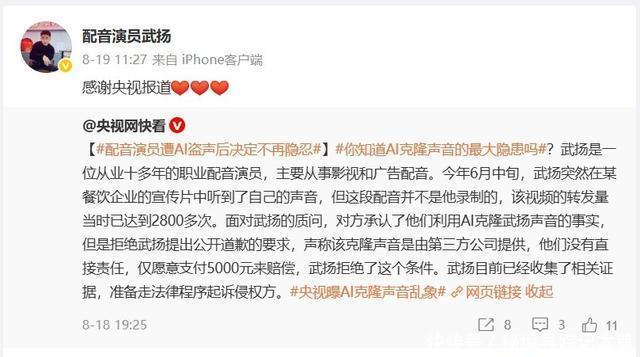 四 有人算过一笔账: 做一场AI换脸直播,成本只要几百块。 一张素材视频、一个AI训练模型、一段语音克隆,就能生成“完美主播”。 能带货、能直播、能做短视频。 假的,甚至比真的更“完美”。 但维权呢?难。非常难。 前段时间,配音演员武扬的声音被AI盗用。 对方拿他的音色卖课、配广告。 他她花了半年取证,最后赔偿5000块。 没有道歉。